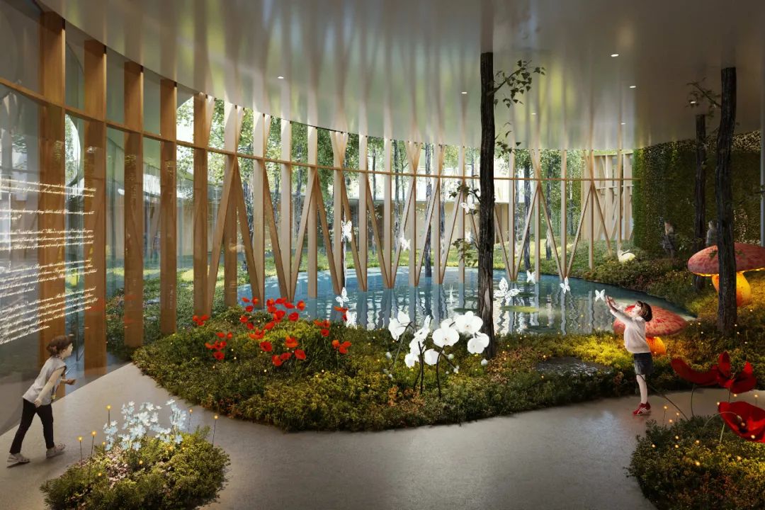 博物馆由一系列圆柱结构组成,木质柱子就像森林中的树干;透过玻璃幕墙,可以与外部自然环境“对话”,也可以感受不同光线带来的空间变化体验;略微凹入的屋顶是为了容纳空中花园,所有绿色元素无一不在强调“自然”与“可持续”。