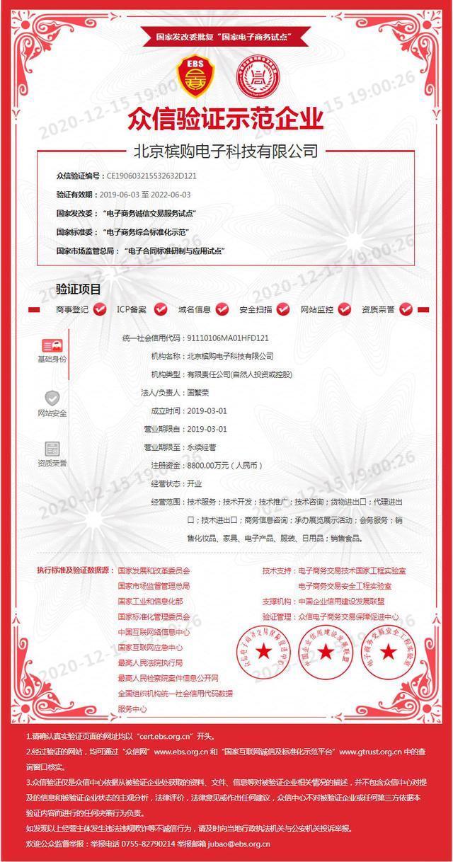 恭喜北京槟购电子科技有限公司(以下简称:槟购跨境)顺利通过“众信验证示范企业”认证,成功纳入国家发改委“电子商务诚信交易服务试点”、国家标准委“电子商务综合标准化示范”、国家市场监管总局“电子合同标准研制与应用试点”三个国家试点项目。