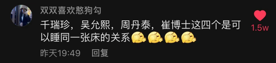 千瑞珍出轨周丹泰,周丹泰曾是吴允熙情人,吴允熙是夏博士初恋,夏博士又是千瑞珍前夫。
