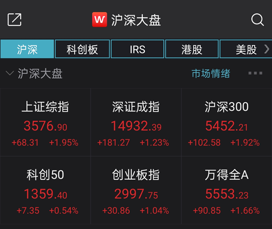 3月3日,A股三大指数低开高走,午后涨幅扩大。截至收盘,上证指数涨1.95%,报3576.90点;深证成指涨1.23%,报14932.39点;创业板指涨1.04%,报2997.75点。