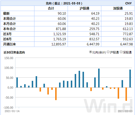 年初至今北向资金合计净买入871.88亿元,而2020年全年北向资金净流入2089.32亿元。