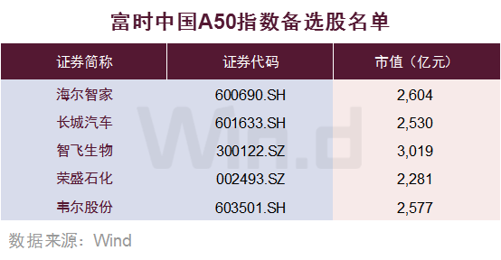同时,富时罗素公布了新一季的备选股名单,备选名单即刻生效,直到下季度成分股审核前,如果有一个或多个成分股被删除,即将选用这5个备选股:海尔智家,长城汽车,智飞生物,荣盛石化,韦尔股份。