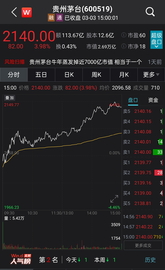 周三贵州茅台等抱团股集体反弹修复。截至收盘,茅台大涨近4%,酒鬼酒涨超6%,今世缘、洋河股份等全线回暖。