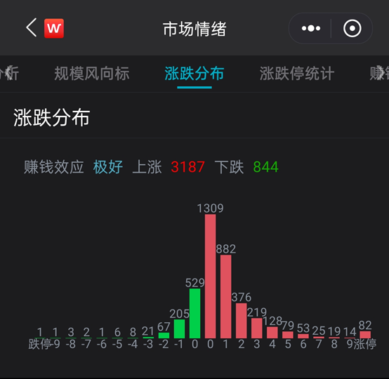个股呈现普涨局面,两市上涨3187家,下跌844家,两市共82股涨停,市场赚钱效应极好。