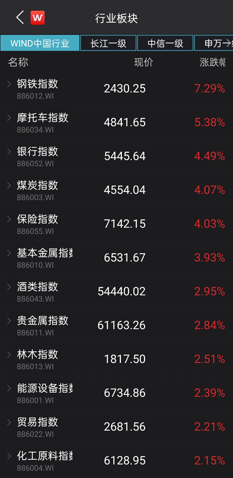 周期、金融板块爆发,钢铁板块上涨7.29%,三钢闽光、新钢股份、包钢股份、鞍钢股份、方大特钢等涨停。