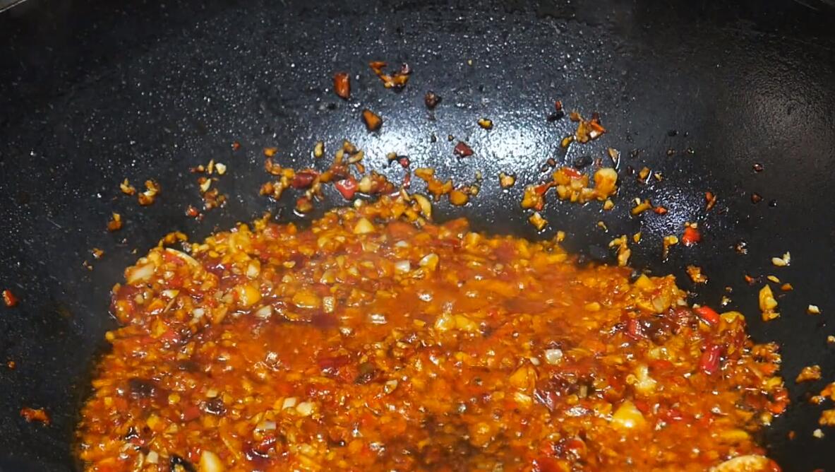 3、再次起锅,锅中倒入适量食用油,油热后下入切好的姜末、蒜末,开小火不断翻炒爆出香味,炒出香味后,下入一勺郫县豆瓣酱和一勺辣椒酱,继续开小火不断翻炒出红油;
