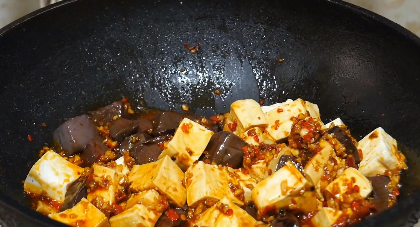 2、因为豆腐和猪血都很容易碎,所以炒制的时候要轻轻翻动。