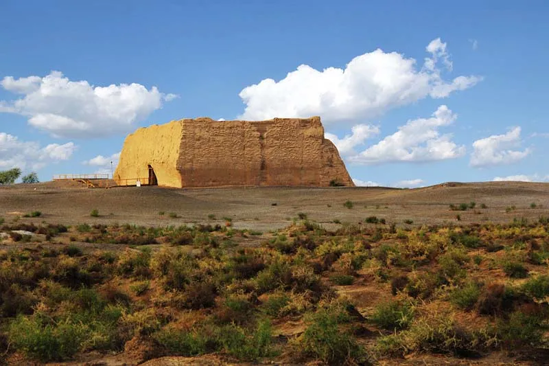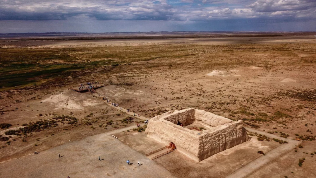 出了游客大厅,举目即可看到耸立在戈壁滩上的小方盘城,这座小城堡在过去是戍边将士的办公场所。遗址内建观景台,边塞风光一览无余。