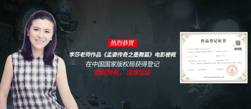 近日,由李莎老师创作的作品《孟婆传奇之墨舞篇》电影梗概,通过相关申请而获得了在中国国家版权局方面的著作权登记,受到版权法的保护与认可。