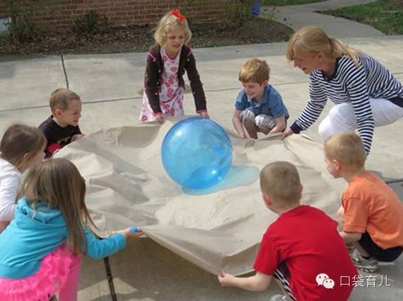 这个游戏都是关于团队合作的,用一块布当作“降落伞”,让小朋友们拉着边缘,一起数数举起,并让球飞起来,整个过程还不能让球跑出“降落伞”