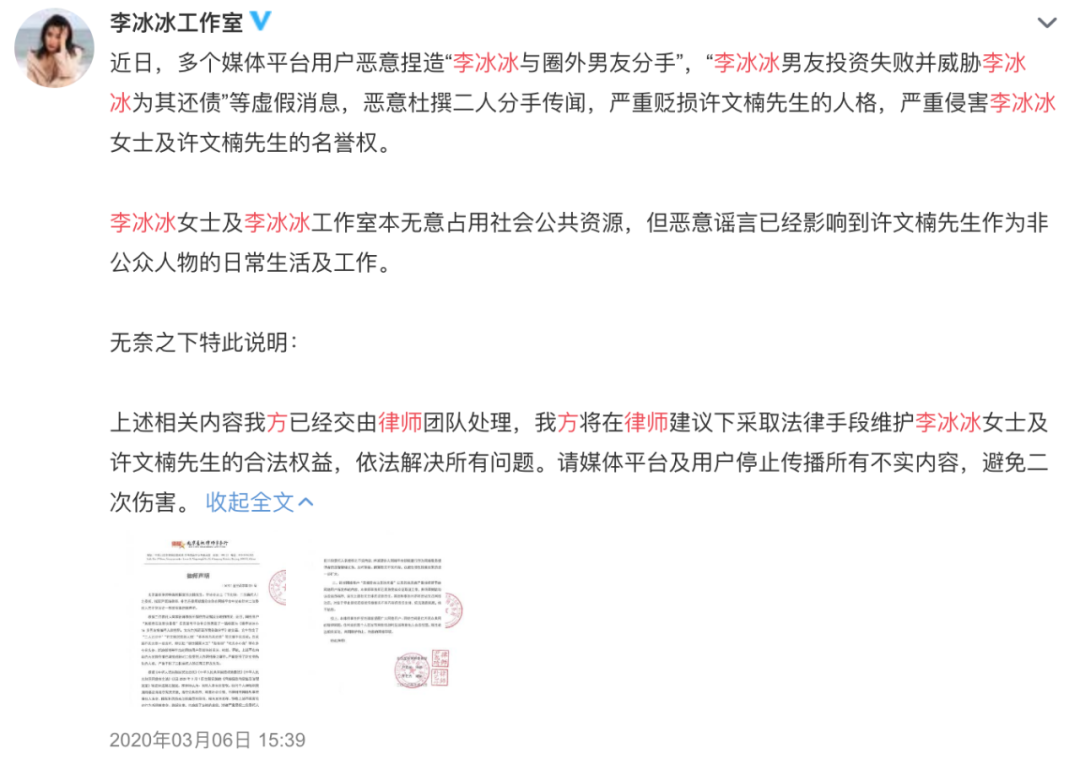 去年,许文楠因被传欠债千万,让女友李冰冰来还债的传闻几度冲上热搜。很快,李冰冰团队迅速反应,和男友一起发表律师声明,最终造谣者公开道歉。