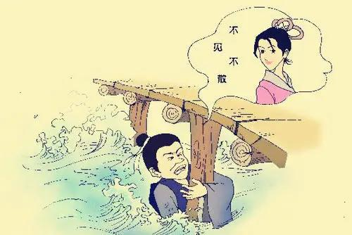 尾生之事,出于《庄子》。《庄子·盗跖》云:“尾生与女子期于梁(桥)下,女子不来,水至不去,抱梁柱而死。”白话翻译为:帅哥尾生与美女约会,地点是在桥梁之下,相对比较私密。尾生早早来到,等候了很久,美女还没来,忽然暴发洪水,尾生坚守桥下之约定,于是抱桥柱不愿离开,滔滔的洪水从他的头部呼啸而去,最后尾生被淹死了。