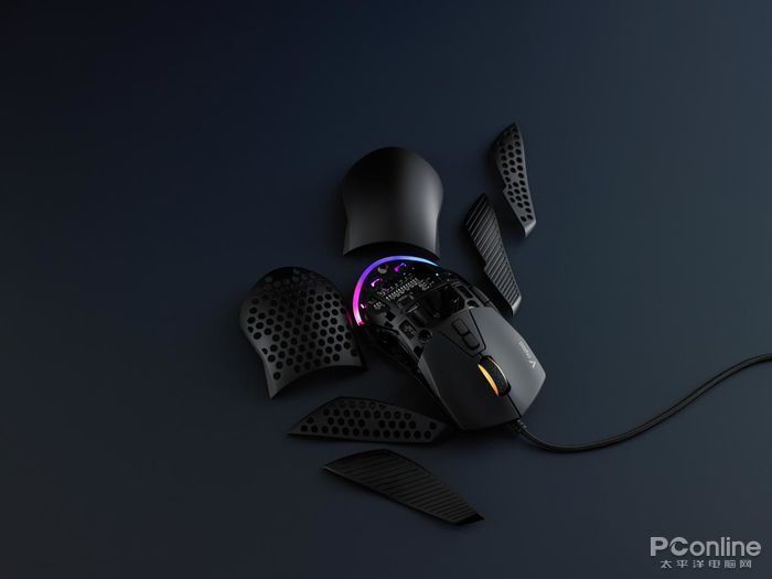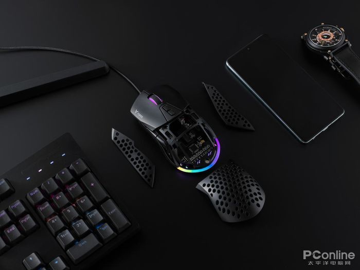 V360最令人惊喜的无疑是机身采用模块化设计,左侧裙、右侧裙、尾部顶盖3个区域,皆采用磁吸式模组设计,3个打孔模组,3个实心模组,可组合出8种不同的手感形态。鼠标内部在确保强度的同时,去掉各种不必要配件,令鼠标的重量进一步降低。其中全打孔、全实心,全实心顶盖配重块,可实现约82g、86g、95g三种重量。