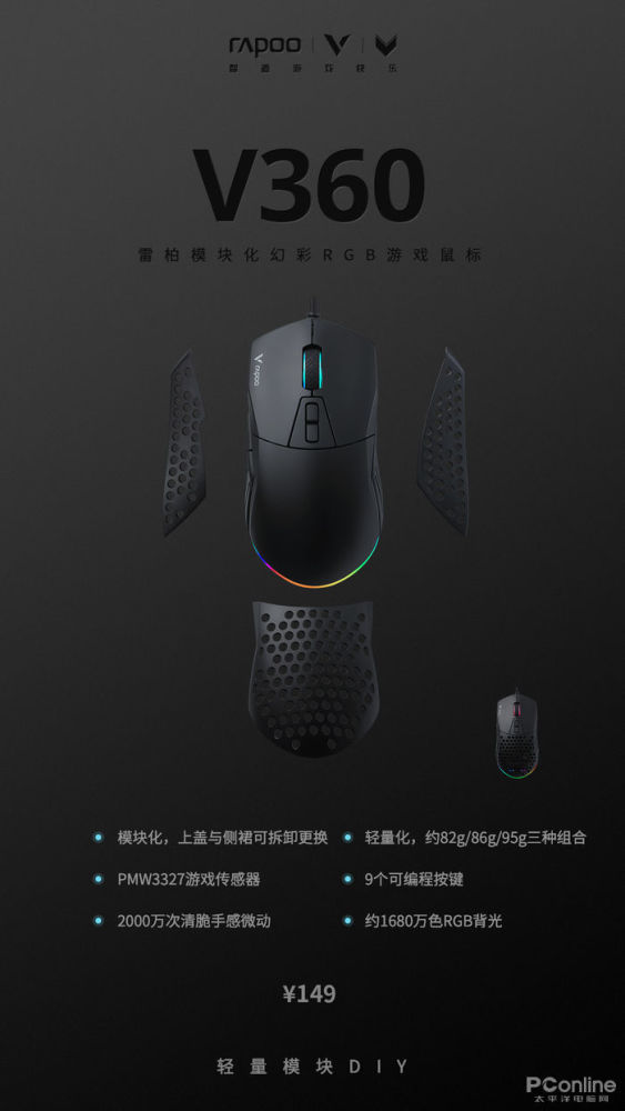 雷柏V360模块化幻彩RGB游戏鼠标。