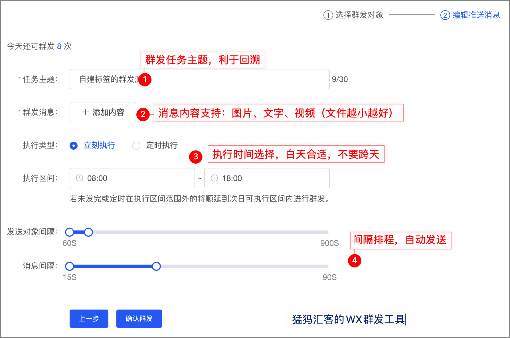 其次,群发内容设置,自由添加文字或图片;选择立即执行或定时执行;执行时间按区间设置,如:8:00-18:00;设置好发送对象间隔和消息间隔。