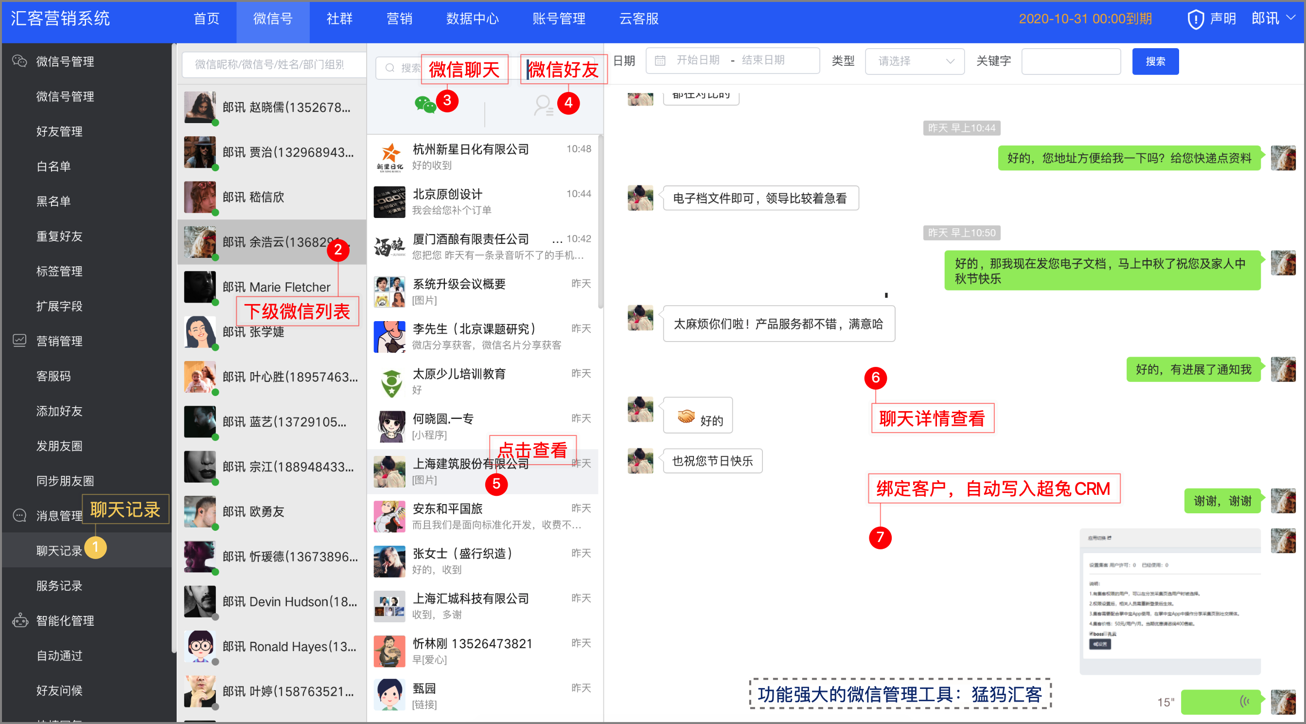 公司上级或者部门上级可以查看自己下级的微信聊天内容,操作快捷:上级登录猛犸汇客账号-选择下级微信-点击下级微信好友,即可看到微信聊天记录。管理者能在第一时间看到销售与客户的微信聊天过程,辅助跟单成为可能。