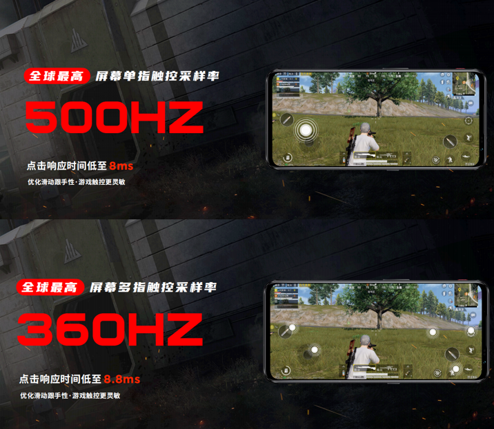 当然,作为专业的电竞装备品牌,光有显示刷新率还不够,因为屏幕对于手机而言不仅是显示设备,同时还是游戏中最为重要的操控输入界面。为此,腾讯红魔游戏手机6系列在游戏操控设计上再度突破,首发了500Hz全球最高的屏幕单指屏幕触控采样率和360Hz全球最高的屏幕多指触控采样率。并且不同于其他机型只强调单指触控的速度,腾讯红魔游戏手机6系列通过对多指触控采样的优化,还实现了在游戏操控场景下低至8.8ms的操控延迟表现,真正让玩家同时享受到显示与操控的双重低延迟的BUFF。