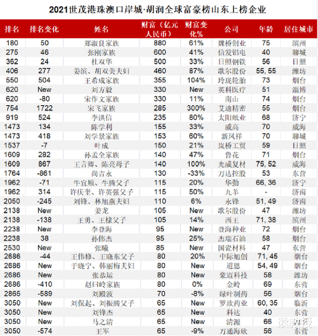 排在上榜山东企业家第五位的是玲珑轮胎的王希成家族,财富增长104%至355亿元。这家国内第二大轮胎生产商,旗下有玲珑、山玲、利奥、阿特拉斯等知名品牌。产品远销全球180多个国家和地区,广泛应用于商用车、乘用车、工程机械等领域,成功进入奥迪、大众、福特、雷诺日产三菱等知名汽车品牌的全球配套体系,并为中国一汽、东风汽车、上汽通用五菱、吉利汽车、比亚迪、奇瑞汽车等国内外多家知名汽车厂的100多个制造基地提供配套。