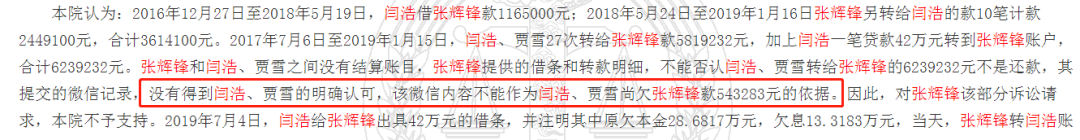 安徽省太和县人民法院认为,贷款人张辉锋提交的微信记录,没有得到借款人闫浩的明确认可,因此,该微信内容不能作为闫浩尚欠贷款人张辉锋相应金额的依据。