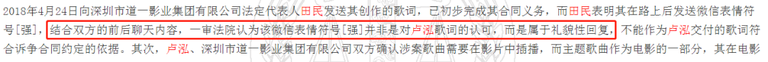 “结合双方前后的聊天内容,一审法院认为,该微信表情符号并非是对卢泓歌词的认可,而是属于礼貌性回复,不能作为卢泓交付的歌词符合诉争合同约定的依据”。