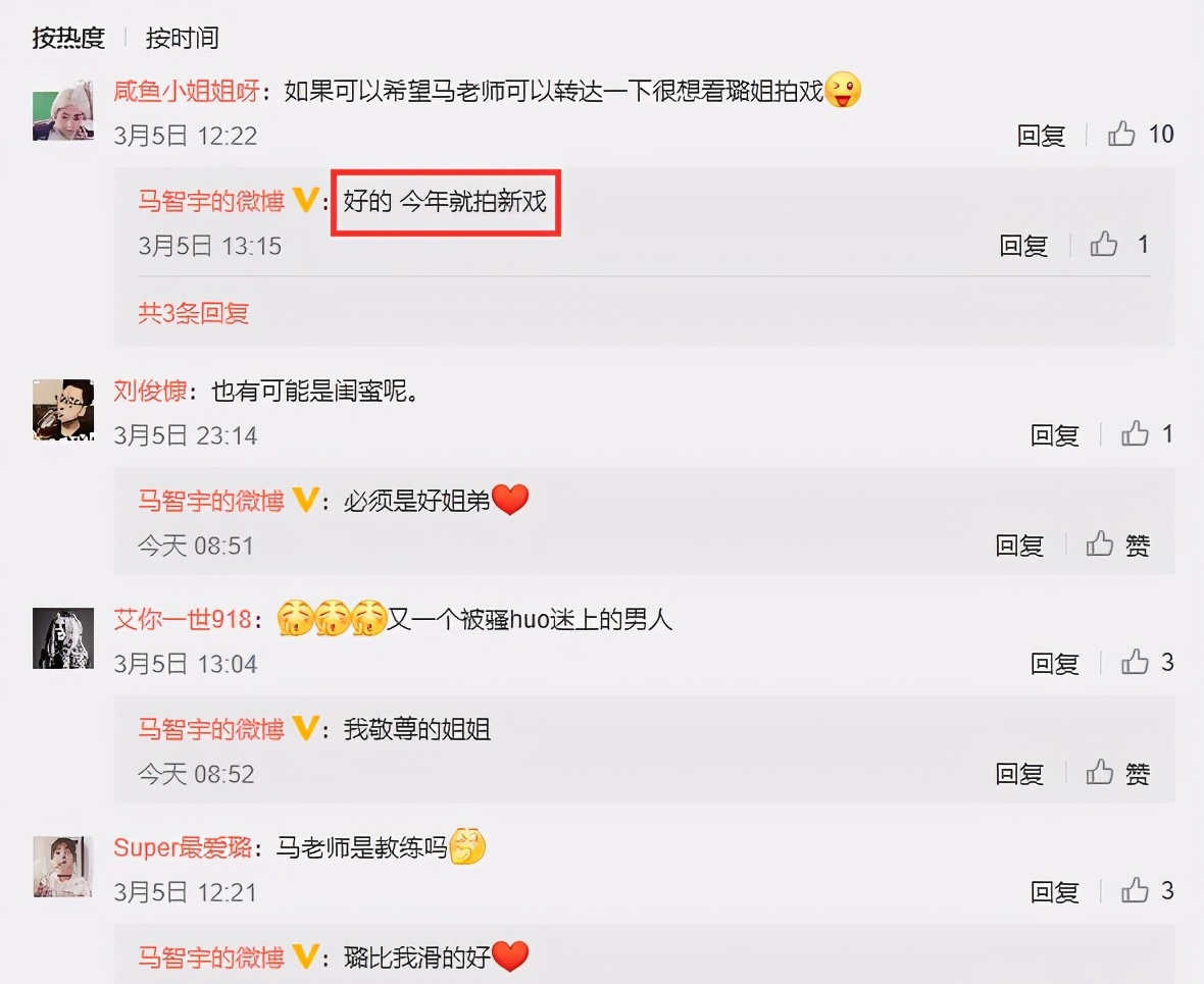 虽然李小璐通过不同的方式活跃在公众面前,但是大多数人还是希望她能够出现在荧屏当中。于是就有粉丝求马智宇帮忙转告,想看李小璐进组拍戏,而让人没想到的是,马智宇非常客气回答道:“好的,今年就拍新戏。”