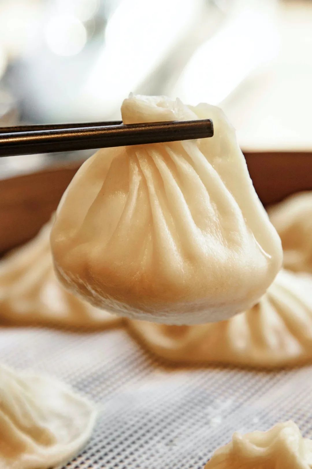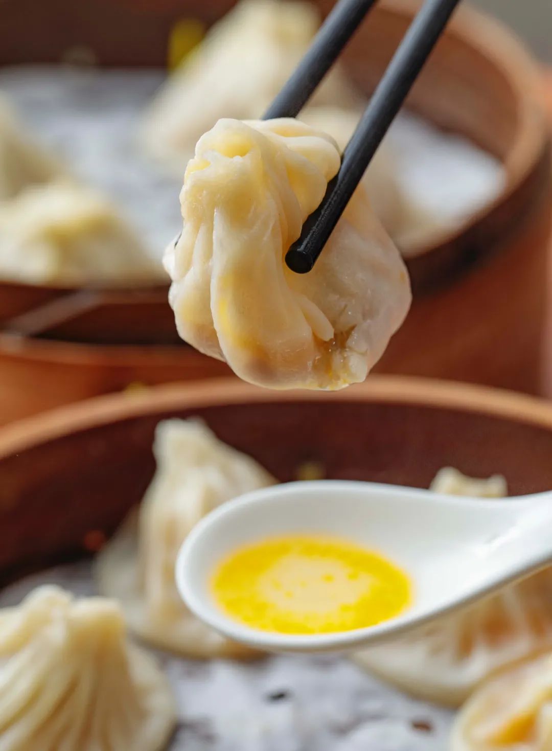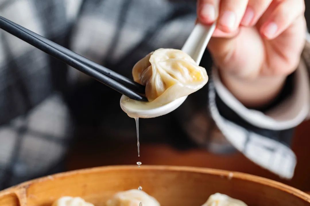 用筷子轻轻提起一只小笼,咬开一个小口,让热气腾出一会,再小心吮吸出其中的鲜美汤汁,最后整只吞下,超级满足。