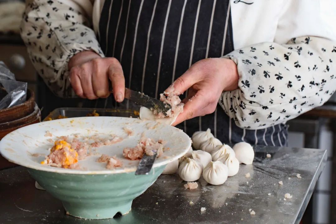麟笼坊小笼用的是生台面的擀皮方法,皮薄到可以透着光看清内部的馅料。