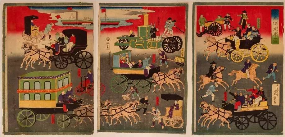 明治维新时代西洋事物涌入日本,这幅浮世绘即表现了当时日本开化之风的情景