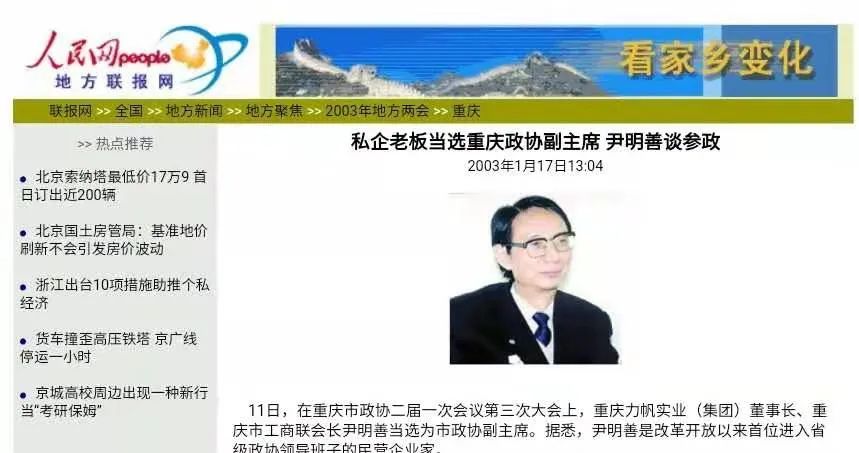 为了拿到轿车生产目录批文,尹明善四处奔波,好在自己在2003年当选为政协重庆市第二届委员会副主席,分管经济,政协副主席,算是省部级的高官了,有参政议政的资格,政治资源比一般人多得多。