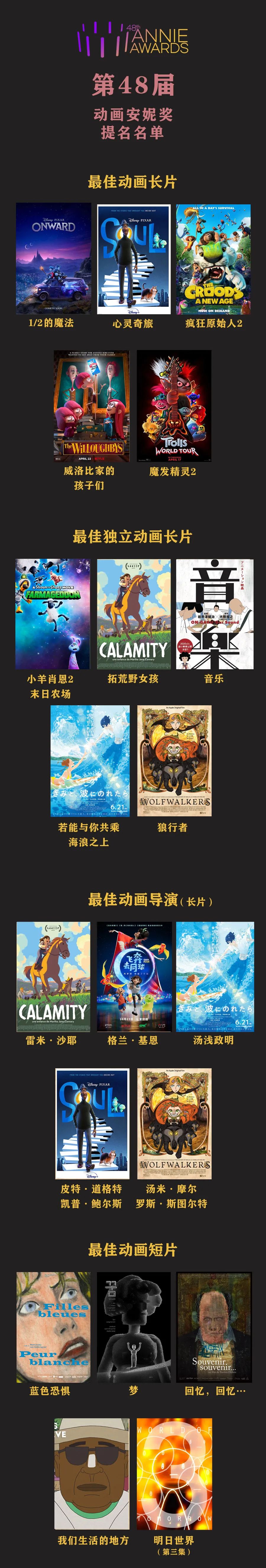 今年电影的提名名单中,《心灵奇旅》与《狼行者》势均力敌,均获得10项提名,领跑名单;而《1/2的魔法》、《飞奔去月球》以7项提名紧随其后;《疯狂原始人2》、《威洛比家的孩子们》以6项提名,位列第三。
