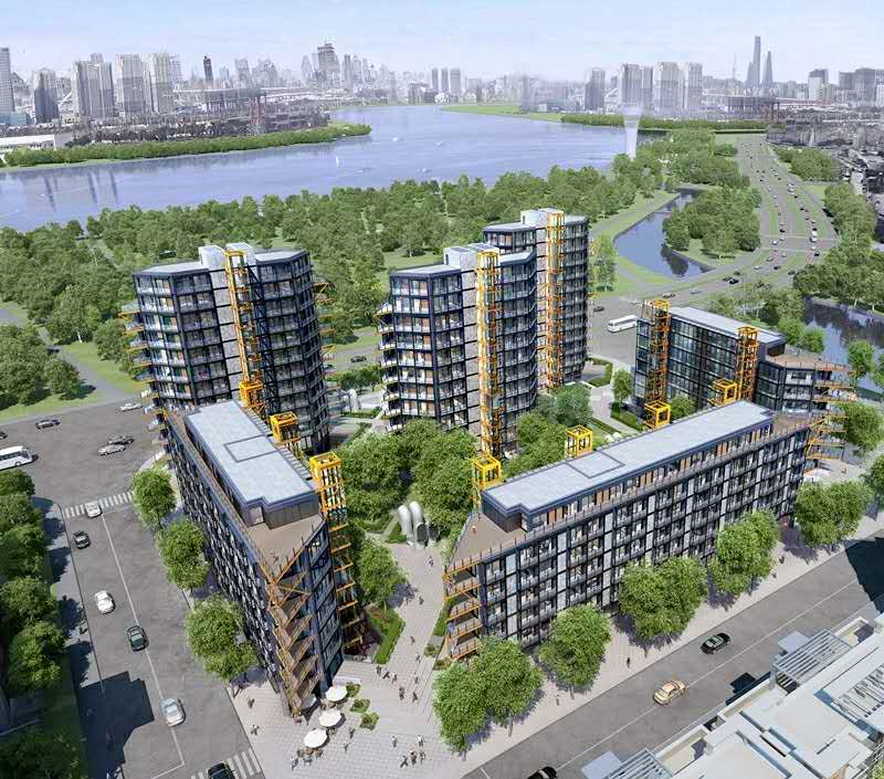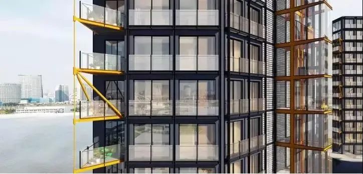 这种拼装式结构最典型的特征便是:“钢筋外露、拥有独特的机械美”!就像浦江壹号明黄色的室外阳台和观光电梯,鲜明的彩运用,远远看去就十分惹眼,配上大面积的玻璃很难不让人一眼记住。