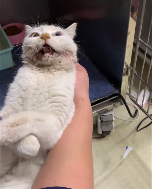 下巴骨没有打骨折,只有轻微的裂缝后期会长好的,只能简单地将韧带皮肤缝合包扎好,以后饮食上只能用食管喂养了,两个小时候过去了,猫咪的的痛苦又开始慢慢的展现出来,看着猫咪这个样子心里真不是滋味,流浪猫的生命就那么不值钱吗?