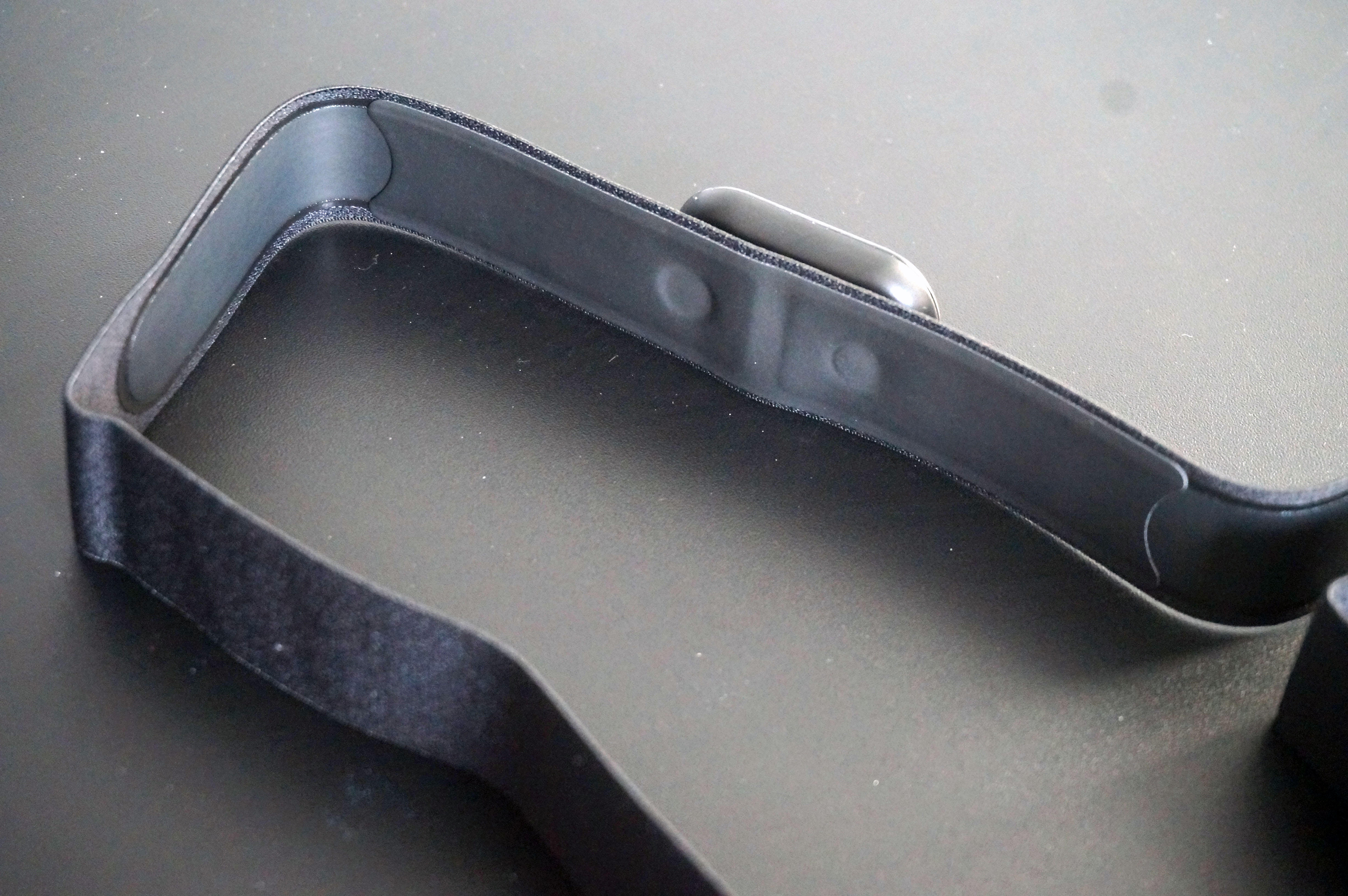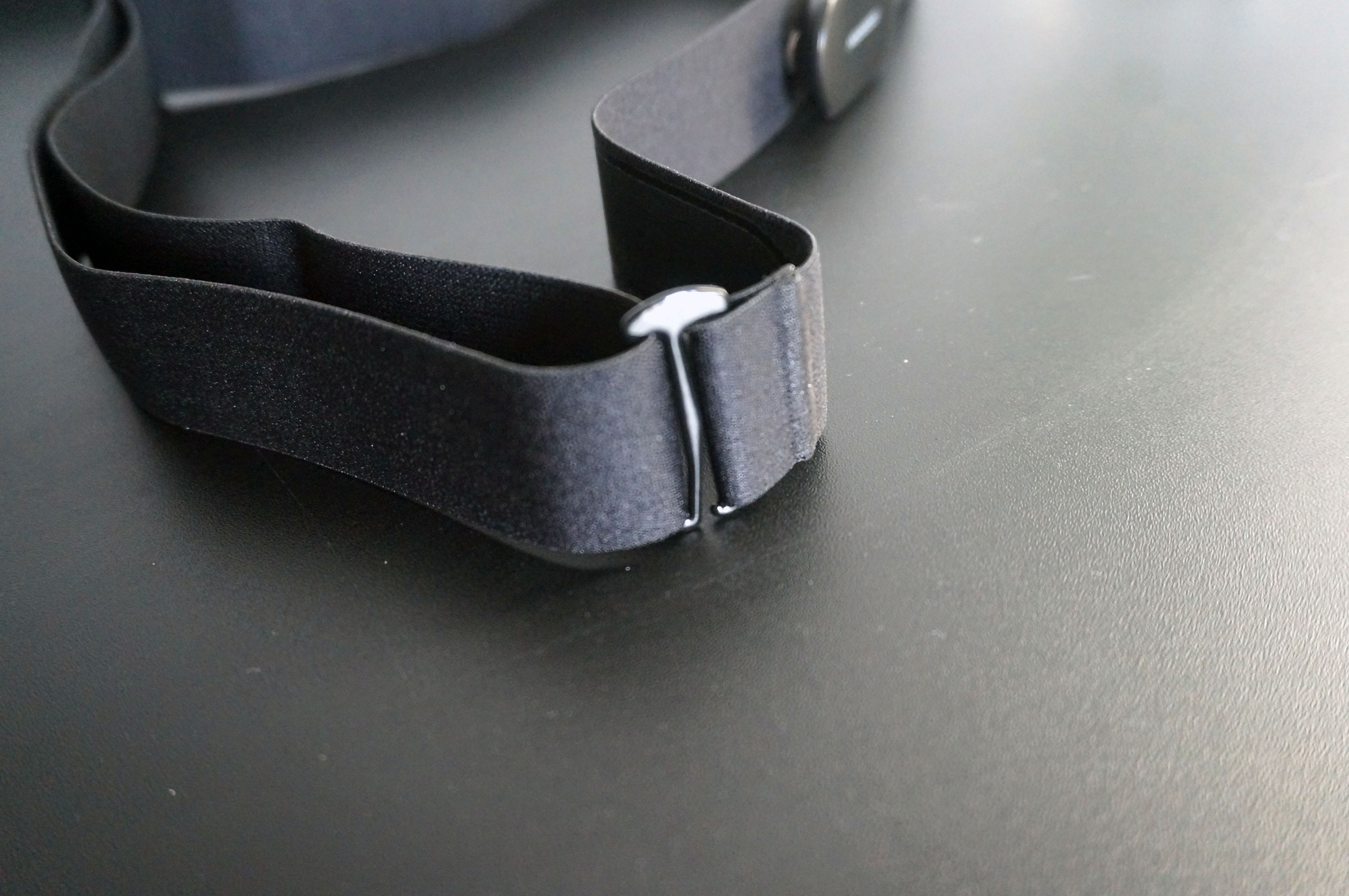 心率带的设计也非常的有意思,首先是整个绑带采用了弹性的设计,同时绑带的长度还支持伸缩,能够更好的适应不同胸围的人群使用。其次,在外侧有专门的纽扣固定位置,方便心率监测仪按压和固定;最后在心率带的内侧贴近胸面的导电电极片的部分做了压胶防水处理。