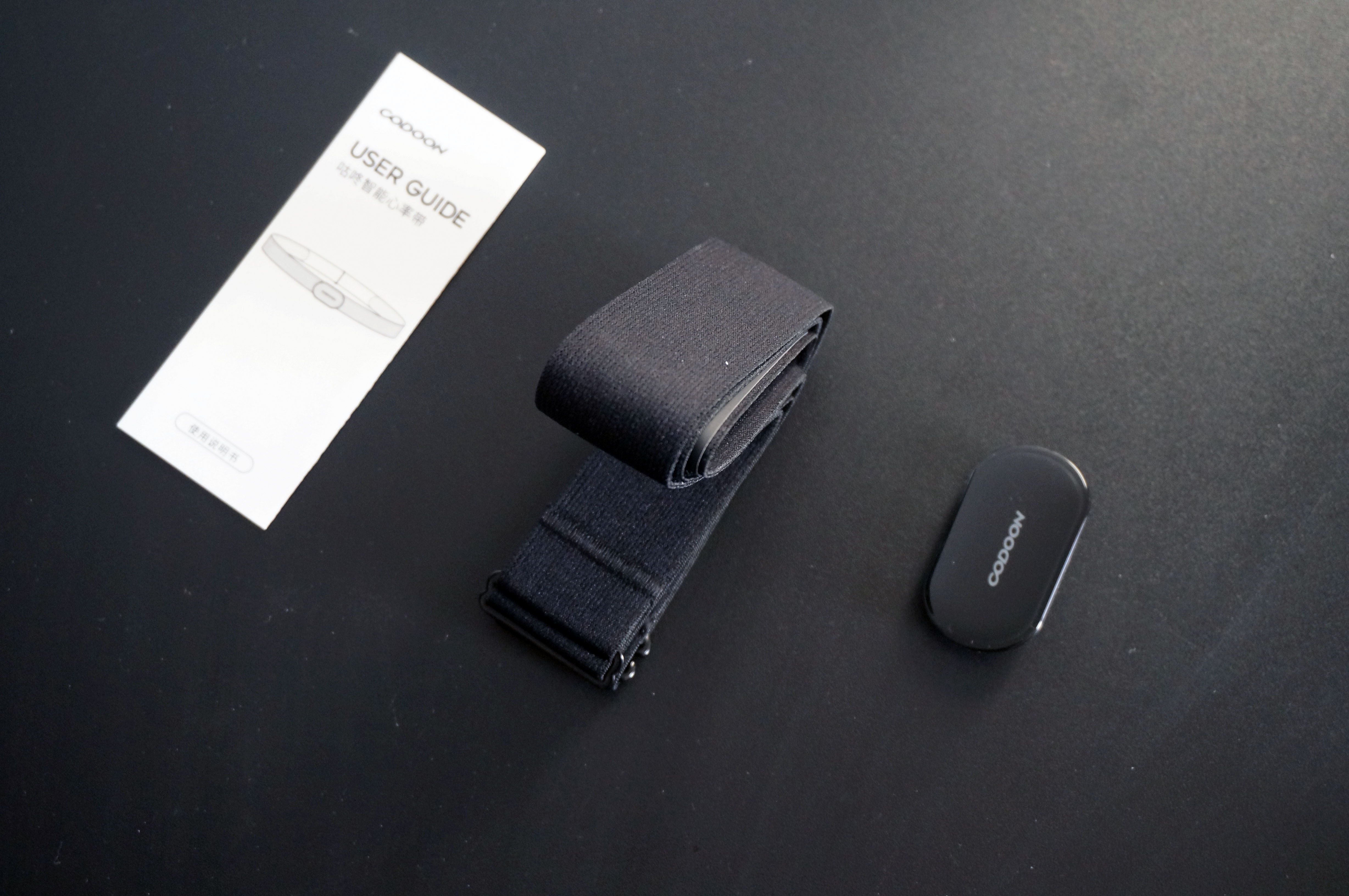 打开包装,取出全部配件,包括有:咕咚心率监测仪、弹性绑带和纸质说明书。