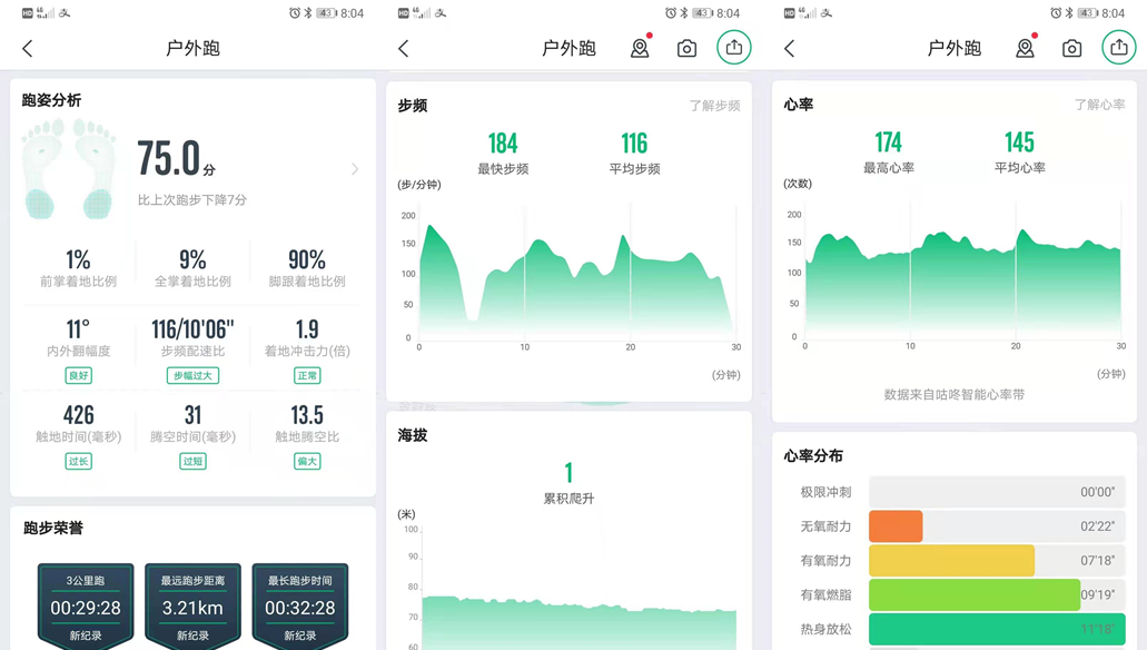从使用的效果来看,咕咚app软件端提供了大量的可视化数据,包括最高心率、平均心率和心率时长分布。这些都有利于个人评估锻炼效果,同时也方便根据数据有节奏地去加强训练。