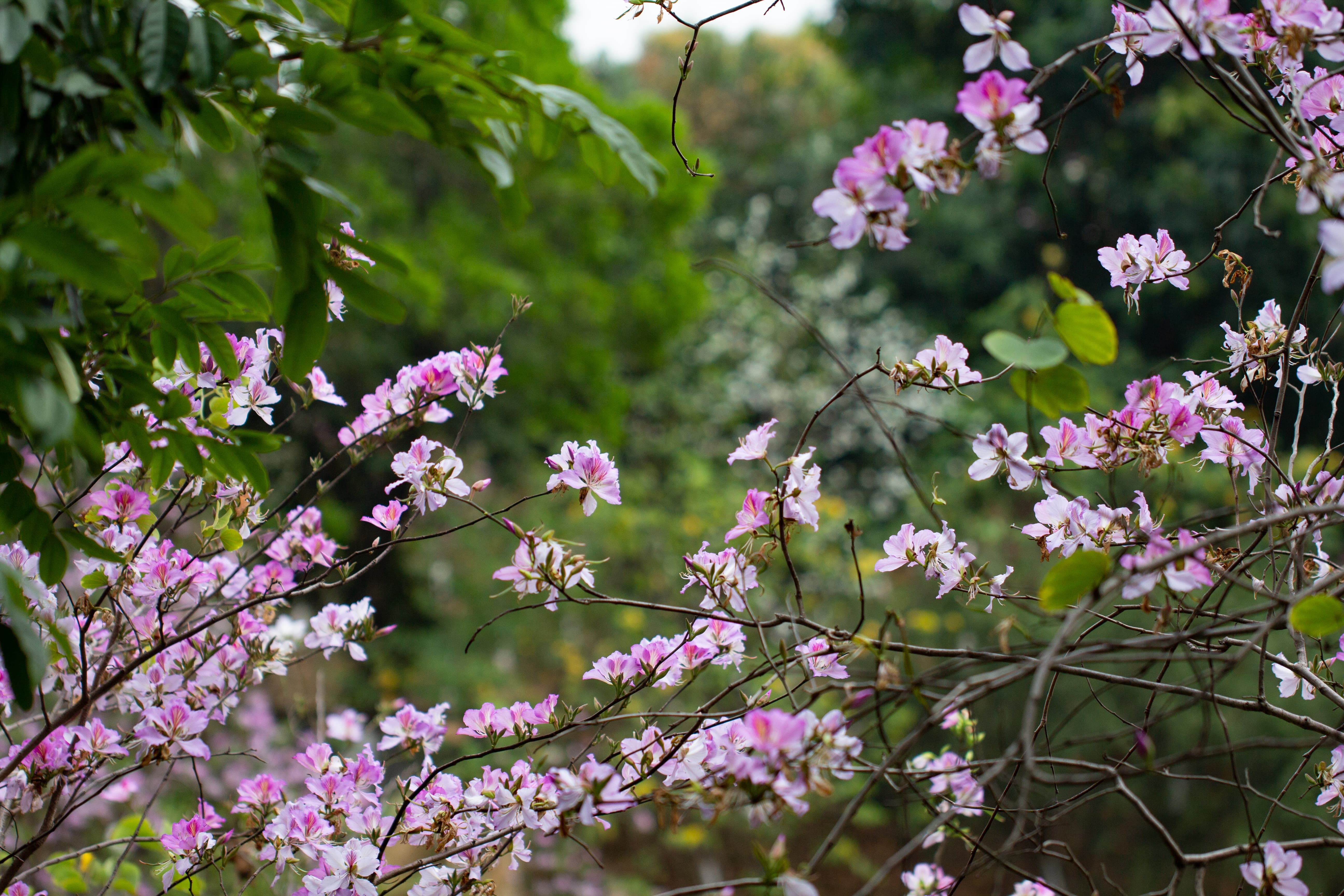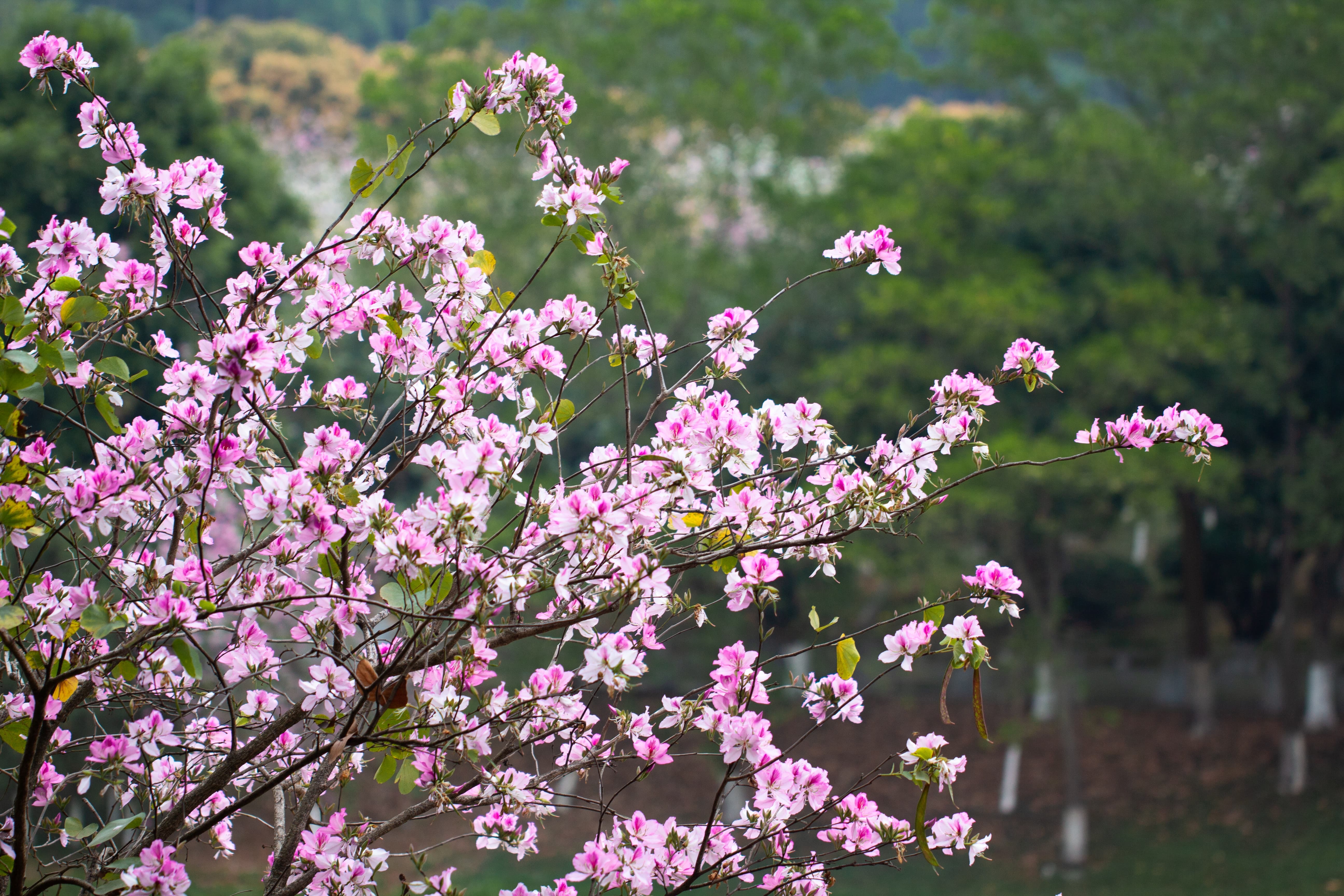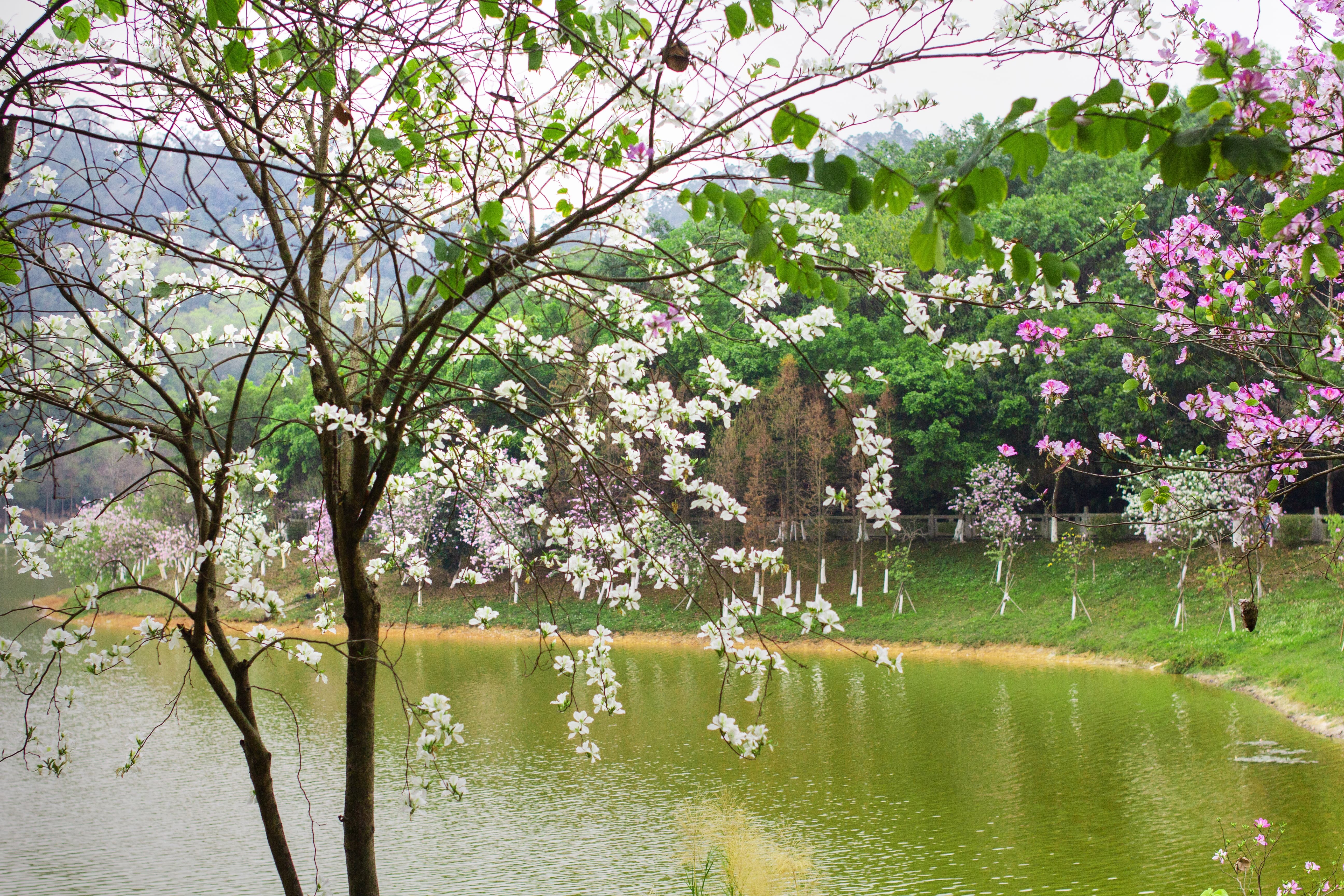 紫荆花大概是广州最常见的花了,可以与随处可见的三角梅一较高下,道路旁、池塘边、公园里、山腰湖畔,都是紫荆花的身影,远远望见一片粉红色或纯白色,漾开一片氤氲,非常耀眼。
