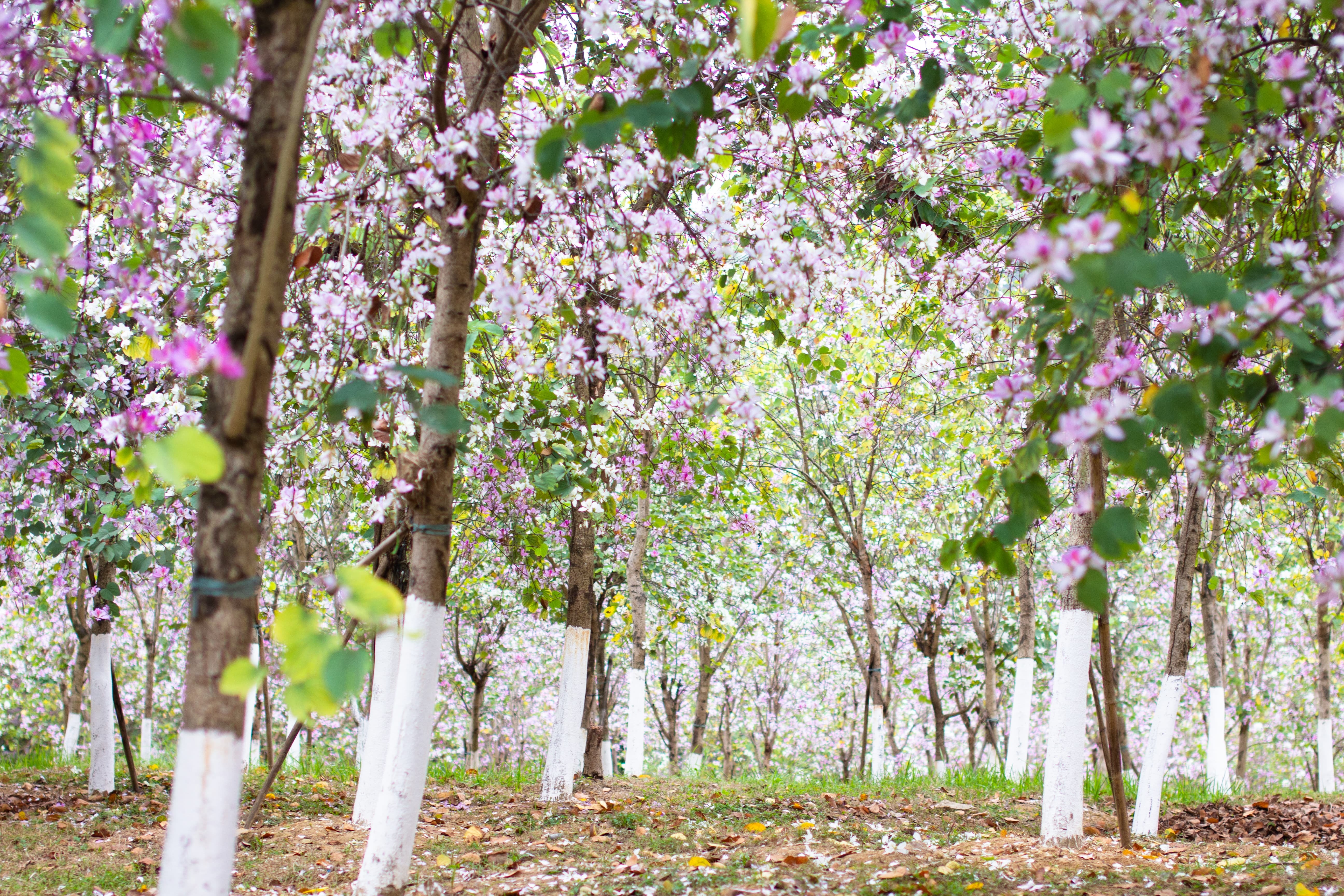 等到进入园子里了,才发现别有洞天,整个空间都是紫荆花的世界。紫荆花树干一列列排成整齐的队伍,树上鲜花比绿叶还要多,树下落英缤纷,花瓣像星星一样点缀着绿色的草地。