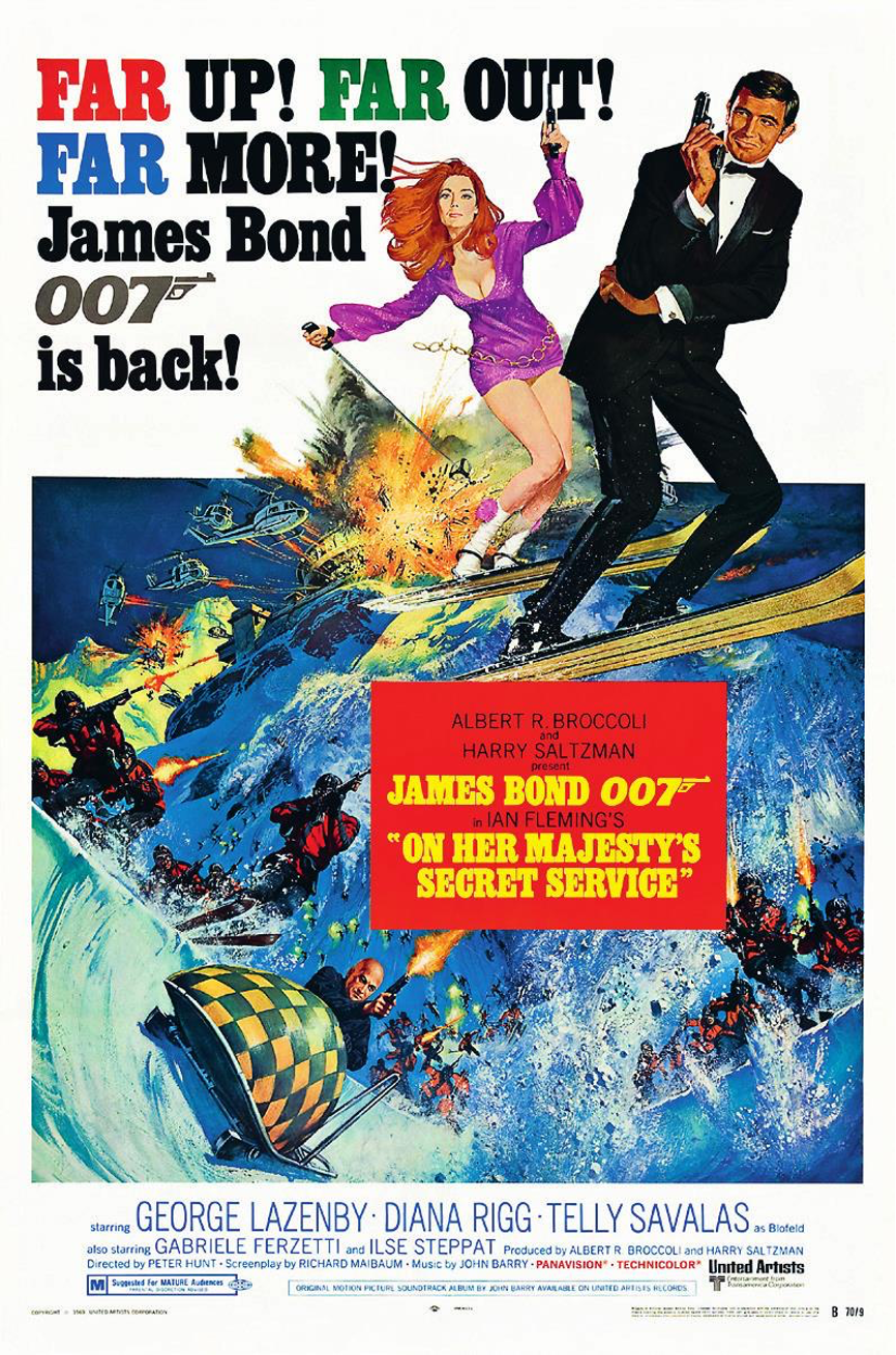 《女王密使》 (1969)海报的宣传重点是让观众放心,他们可以对新邦德拉扎贝怀有同样的期待。影片的主要动作场景再次占据了主导地位。