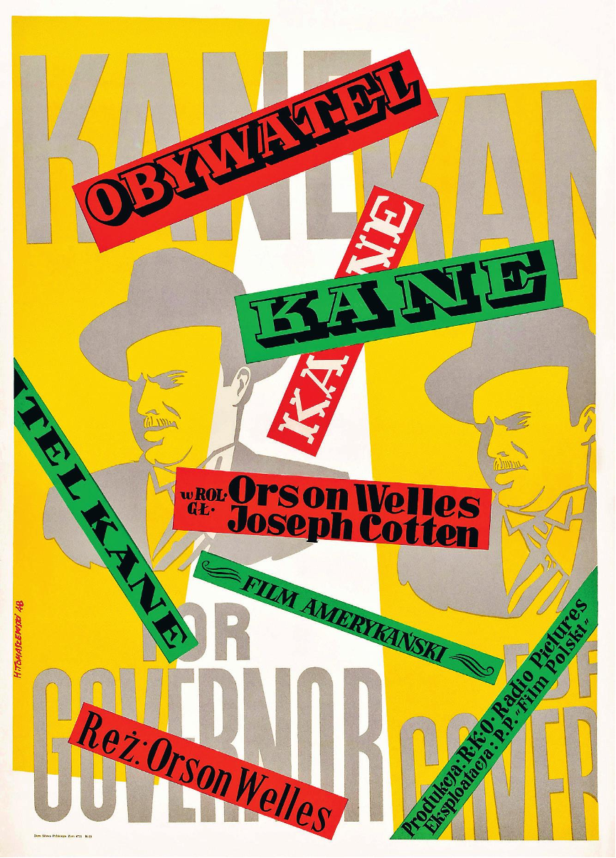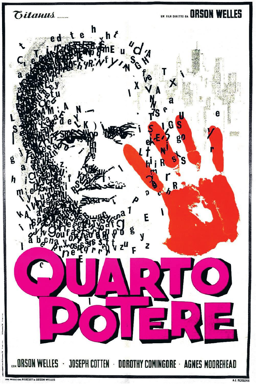 在这幅意大利海报中,字母就像一群蜜蜂,与其说是盘旋在凯恩的脸上,不如说是聚集在一起创造了它。这意味着凯恩创造了他的世界——一部按照他的意愿写就的历史。