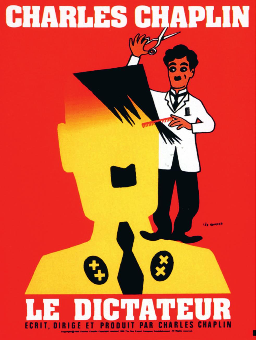 《大独裁者》(1940、1968)这张20世纪60年代的海报巧妙地使用了一张空白的脸——除了独裁者的胡子,暗示了卓别林和希特勒。明星是塑造形象的人。