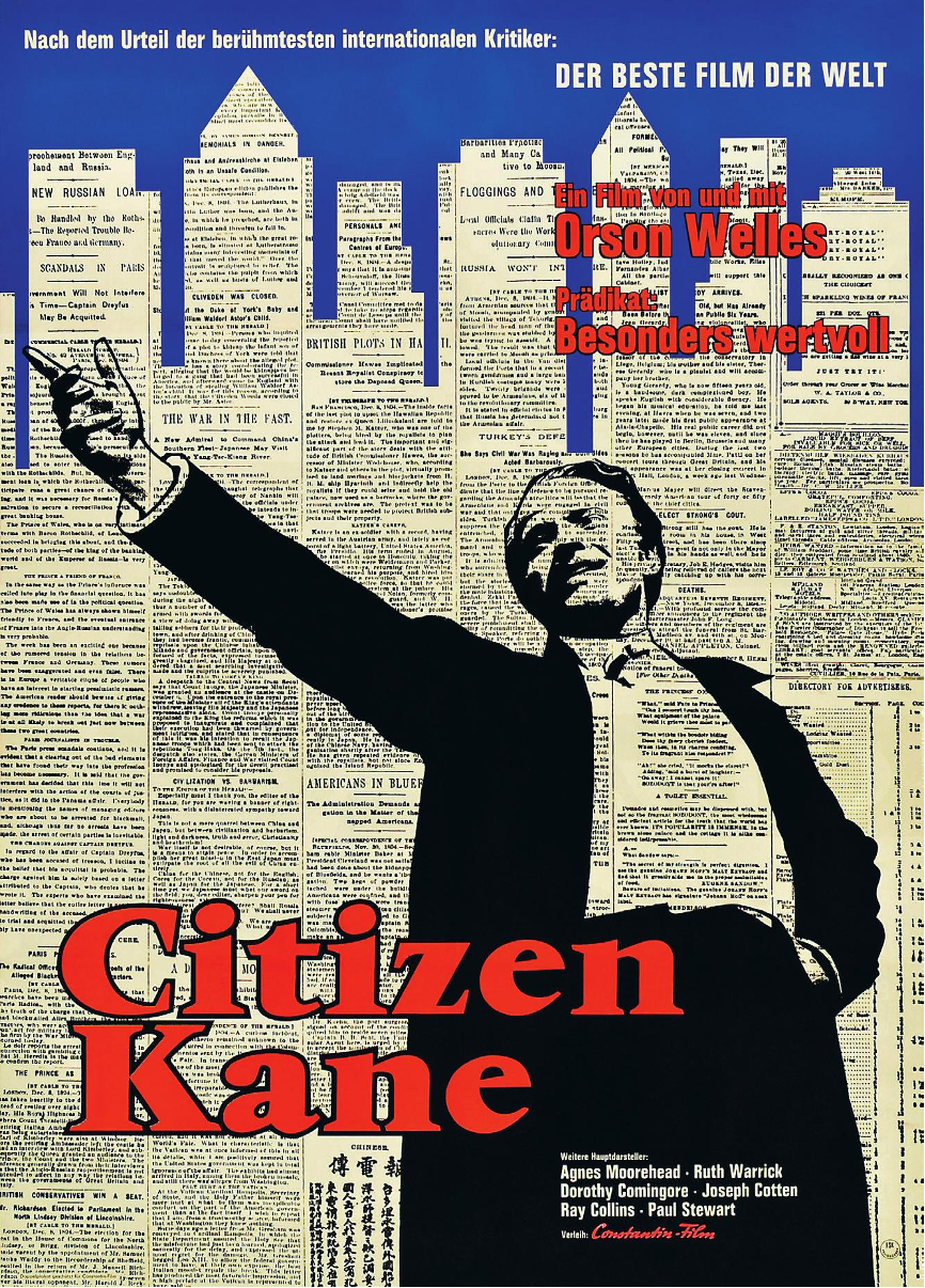 在这张德国海报中,印刷品构建出一座完整的城市。与意大利海报相反,这表明凯恩有能力创造世界,但是这个世界可以变得比他还大。