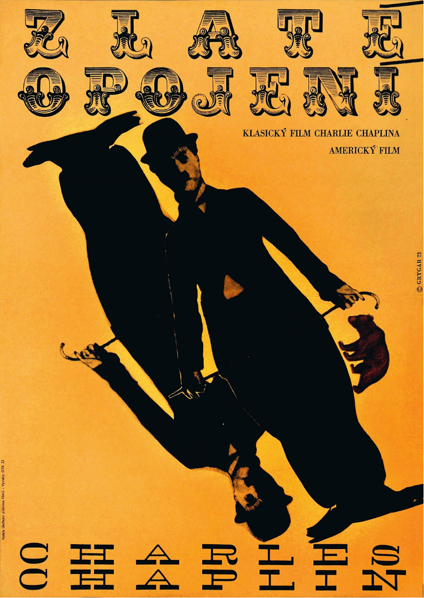 《淘金记》(1925、1973)海报里的人像可以理解为卓别林的世界颠倒了。熊是和电影唯一的直接联系。流浪汉是关键,情景设置是次要的。