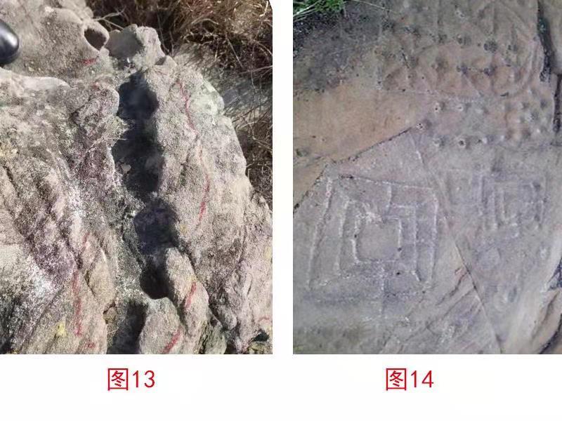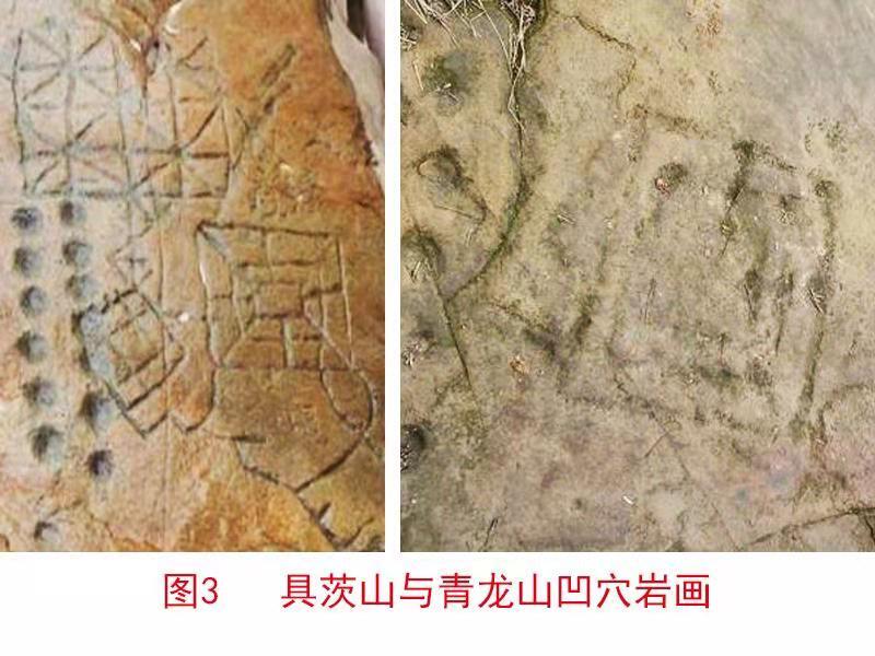 从制作工艺上看,联排凹穴的形成为金属工具加工痕迹明显,散点凹穴的形成石器工具打磨痕迹明显,可见联排凹穴明显晚于散点凹穴。再看与凹穴并存的棋盘状岩画,均为金属刻画线条,个别联排凹穴叠加在棋盘之上(见图三),说明联排凹穴很可能晚于棋盘状岩画。这其中,就蕴含着凹穴文化的演变梯次与规律。