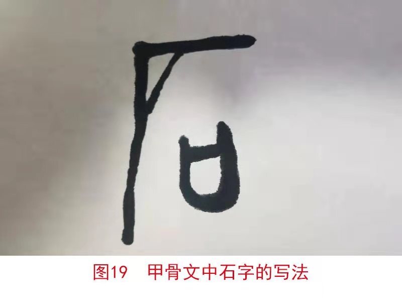 甲骨文的石是崖壁下面画一个口(见图19),这个口一直被错误地认为代表石块,事实上,口代表的是凹穴。在象形文字时代,象形度非常重要,如果口代表石块,绝不会用U形的口的方式表达,完全可以用方形或三角形来表示。为什么说石字下面的口是凹穴?原因一:史前先人将高大的岩壁视为神灵的居所,认为在石壁上的制作的凹穴与神通灵,所以,在创造石的象形文字的时候,将崖壁与凹穴组合,代表石字;原因二:凹穴文化是史前人类最重要、最重大的文化记录形式,采用凹穴来表示最为合理;原因三:口字符号在甲骨文、金文中很多地方都用来表示穴、洞等类似意思。