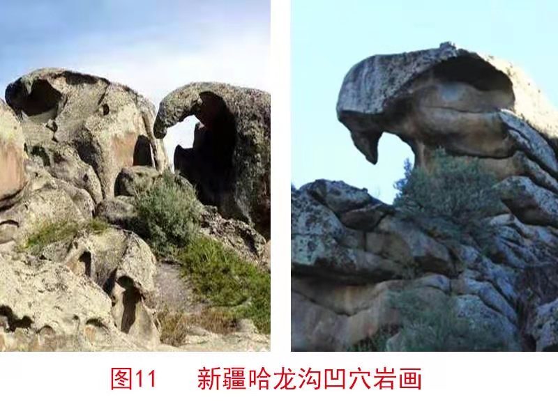 我们在研究凹穴文化时发现,部分凹穴的形成,很可能是在几代人的祭祀信仰活动下完成的。如金寨县葛藤山发现的龙体凹穴岩画(见图2),几乎整个石壁都被磨制成一条条的龙体形状;再看新疆哈龙沟奇石凹穴岩画(见图11),石头被掏空,凹穴口显得非常巨大。在生产工具非常落后的史前社会,不经几代人的磨制是很难达到图片中效果的。由此,我们可以推断,磨制这类凹穴的功能类似藏传佛教念祷经文,藏族人认为,反复念祷经文方可功德圆满,于是在石头上刻着六字真言,在经幡上印着六字真言,寓意风每吹过一次,代表自己念了一遍经文,为自己祷告一次。史前人们认为每在石头上摩擦一下,即代表着某种意义,或祈求多子多福,或祈求平安长寿,或祈求食物富足。