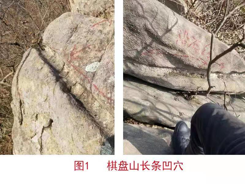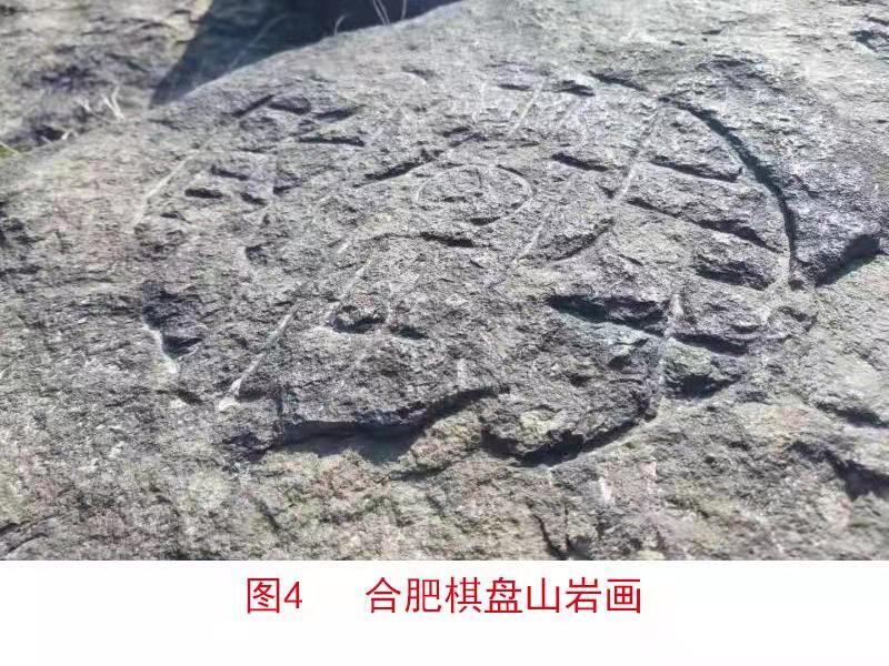 在凹穴岩画形式上,全球总体一致,但又各具特色。例如,合肥棋盘山发现的长条状凹穴岩画多是沿石经走向制作,形状如人工开凿的水槽(见图1);金寨葛藤山发现的长条凹穴则多沿石壁裂缝制作,多条凹穴并列,穴口的两侧打磨圆润,形成一条条石龙状,远看很像屋顶瓦槽(见图2);在新郑具茨山与舞钢青龙山,联排状凹穴与棋盘状岩画则比其它地方常见(见图3),其中青龙山的一幅棋盘状岩画中有明显的凹穴棋子的痕迹;可在合肥棋牌山,棋盘形式的岩画目前仅发现两个,其中一个为圆形棋盘形状(见图4)。