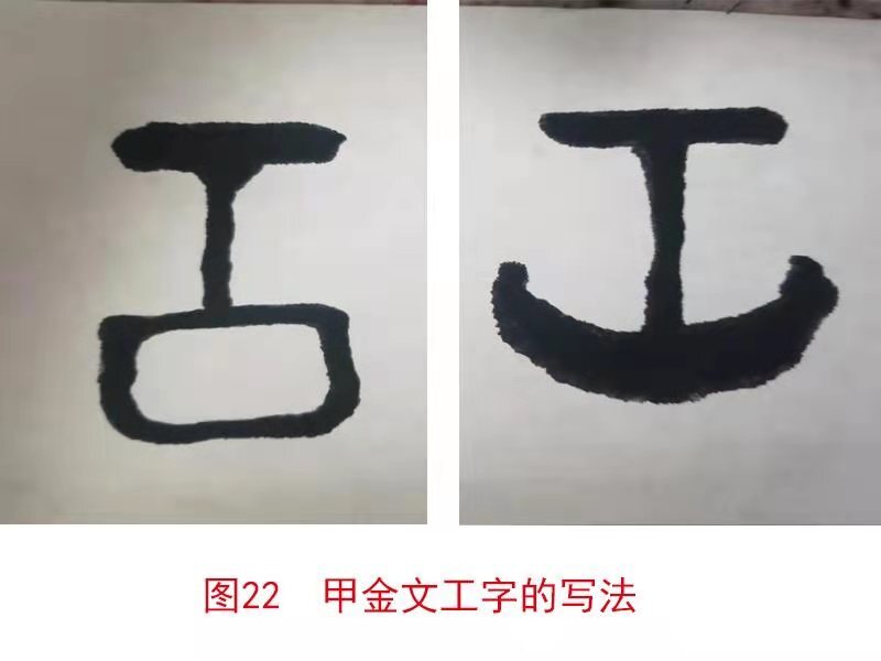 工字在甲骨文中,下面是一个口,口上一个把手(见图22),这里的口同样指凹穴,在金文中有对应凹穴的直接证据,金文的工字下面一个凹穴形状,上面一个把手。而且,甲骨文中的工字通匠字,所以,我们不得不联想到制作凹穴的工作叫做工字。