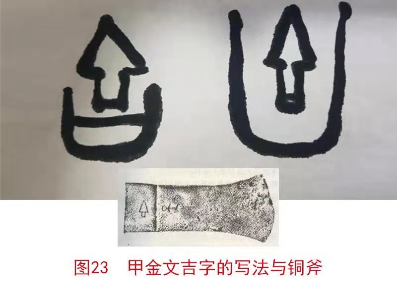 甲骨文中下面是口,口的上面是箭头(见图23)。这里的口肯定不是嘴巴的意思,在其它甲骨上发现的吉字下面是一个杯状,与口绝然不同,因此,我们把这里的口理解为神圣的凹穴最合理不过了。关于吉字上面的箭头部分是什么寓意,有学者认为是族徽,理由是在陕西出土的铜斧上有两个符号,一个是天,一个就是甲骨文吉字上面的箭头(见图23)。神圣的凹穴与族徽组合在一起叫做吉是非常合理的。