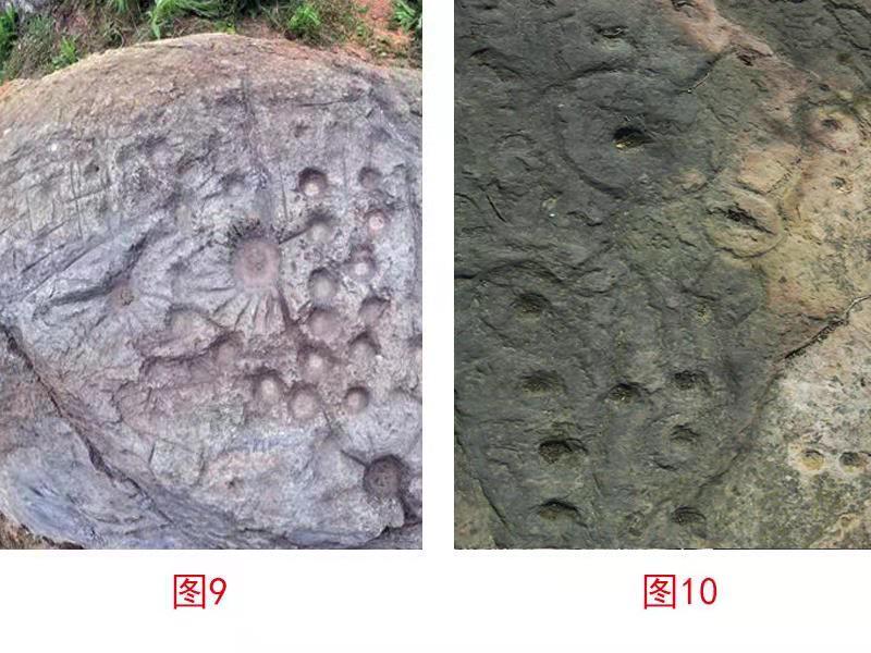 史前人类将对日月星辰的崇拜和相关寄思用符号的形式赋予石头上,以期达到某种目标,这种崇拜寄思形式在世界各地的凹穴岩画及其它形式的岩画上都有明显的痕迹。例如,在随州市桐柏山发现的凹穴岩画中,象征太阳的凹穴岩画就非常形象(见图9);舞钢青龙山发现的一组圆形凹穴网络图,非常接近星相图(见图10);在合肥棋盘山的一块分布联排凹穴石板上,发现了一个甲骨文的“天”字,预示着与天象的某种关联。