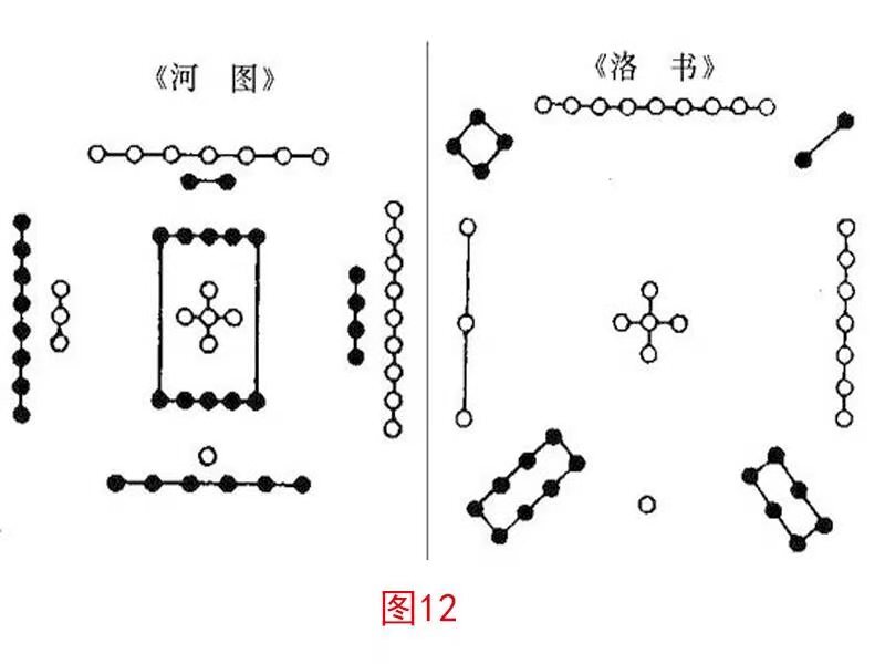在凹穴岩画的后期,随着人类对宇宙的认知越来越多,凹穴的寓意开始转变,从单体逐渐向连体、聚合体推演,最终形成棋盘形式的推演图。由于区域限制,各地交流难度较大,所推演形式有所不同,我们看具茨山棋盘、棋盘山棋盘在细节上有一定区别。易经的前身河图洛书极有可能是在人类较为集中的河(有史学家认为是黄河流域)、洛(史学家认为是洛河流域)这两个地方演化出来的具有当地色彩的星象推演卜算图,再经过后人整理推演,形成易的早期形式。